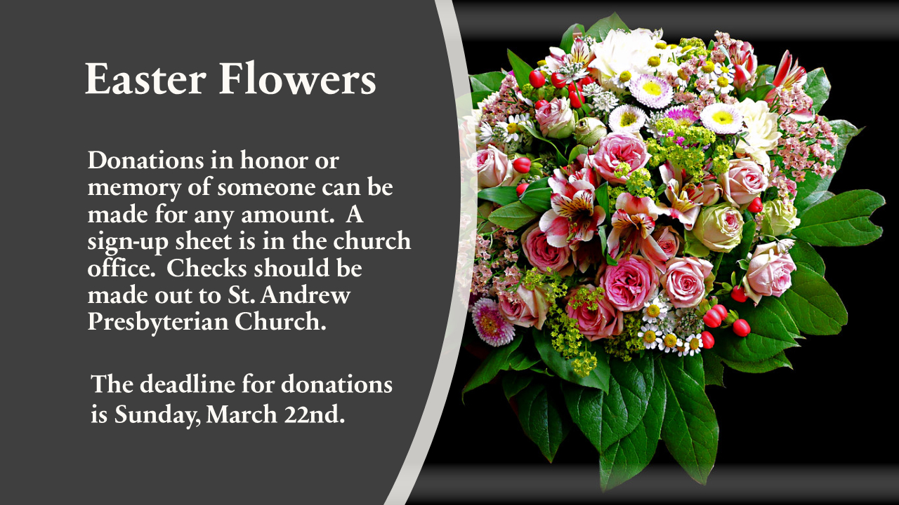 Welcome to worship at St. Andrew Presbyterian Church! We are so glad that you are here. This the 3rd Sunday of worship in the Lenten Season. Sing with us, pray with us as we worship today. Today's sermon is the 3rd in a series of sermons having the theme of 'Boot Camp for the Soul' and is titled "Hydrate" as delivered by Rev. Tripp Brogdon. Today's scripture readings are taken from Exodus 17:1-7 and from John 4:5-15. Copyrighted music is covered through music licenses CCLI #2050370 and One License #A-725168.